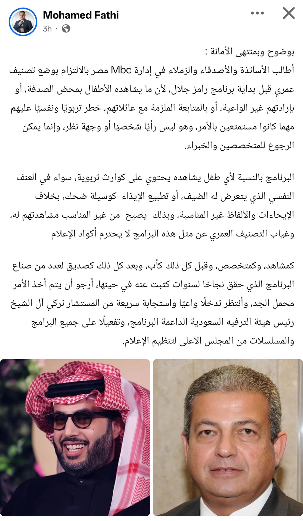 تابع: «كمشاهد، وكمتخصص، وقبل كل ذلك كأب، وبعد كل ذلك كصديق لعدد من صناع البرنامج الذي حقق نجاحًا لسنوات كتبت عنه في حينها، أرجو أن يتم أخذ الأمر محمل الجد، وأنتظر تدخلًا واعيًا واستجابة سريعة من المستشار تركي آل الشيخ رئيس هيئة الترفيه السعودية الداعمة البرنامج، وتفعيلًا على جميع البرامج والمسلسلات من المجلس الأعلى لتنظيم الإعلام».