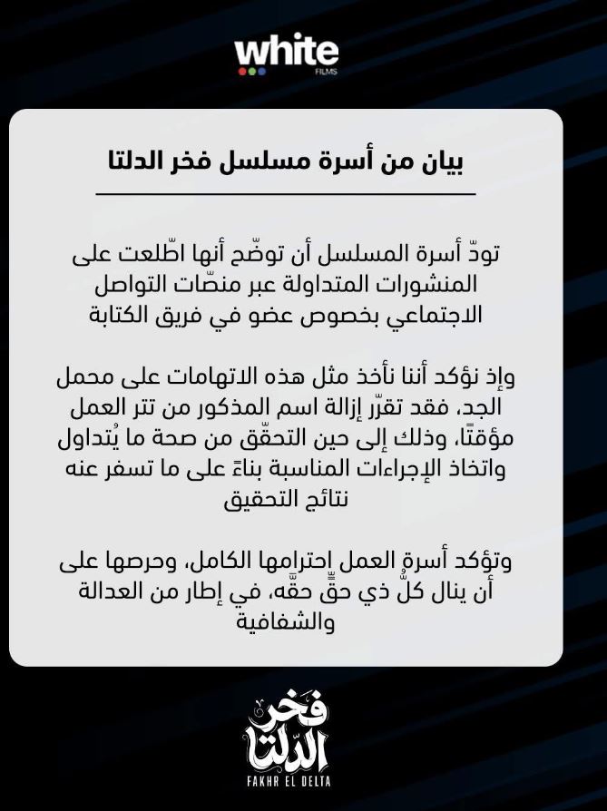 وجاء بيان من أسرة مسلسل فخر الدلتا كالتالي: «تود أسرة المسلسل أن توضّح أنها اطلعت على المنشورات المتداولة عبر منصات التواصل الاجتماعي بخصوص عضو في فريق الكتابة».
