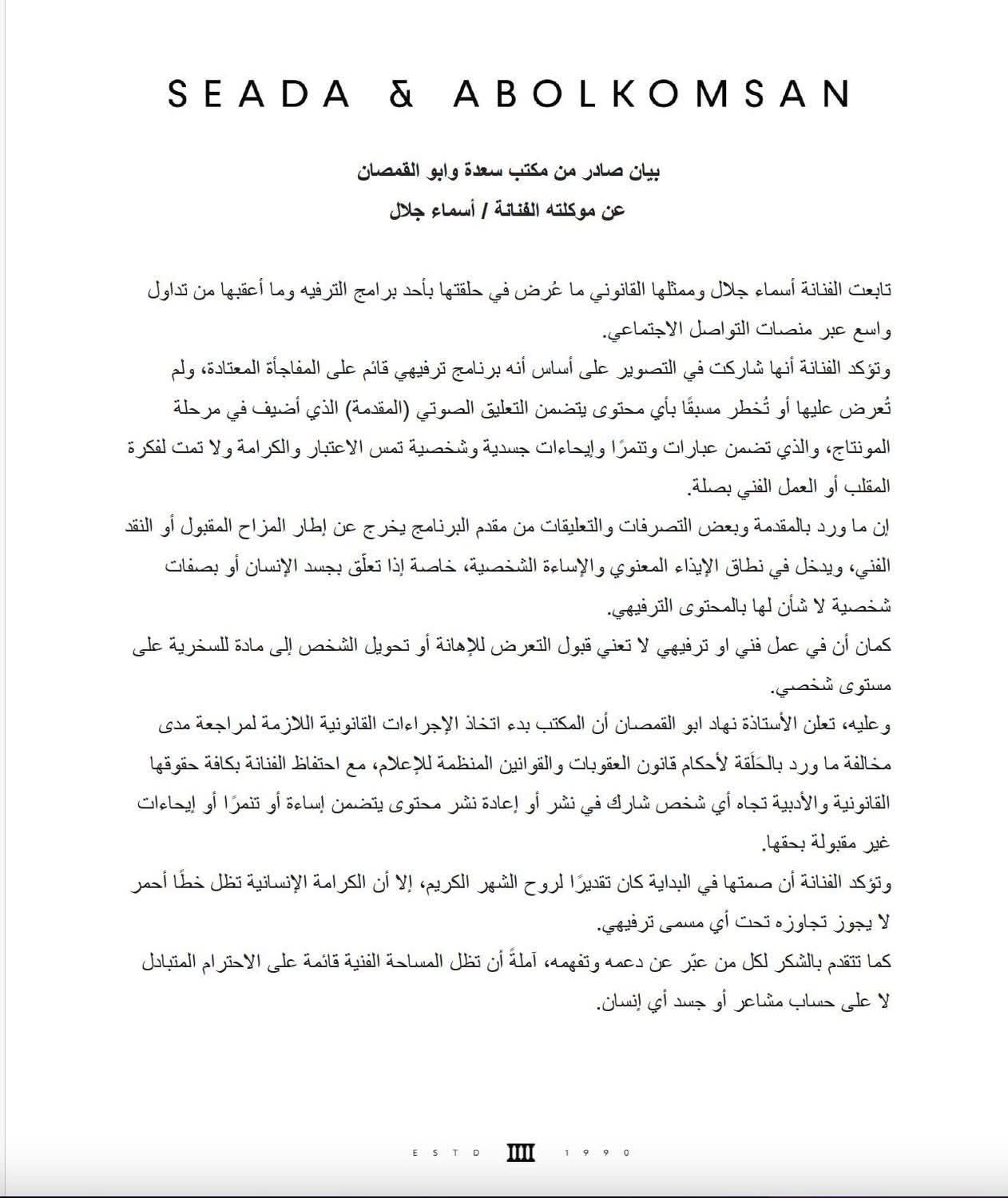 وأصدرت أسماء جلال بيانًا رسميًا، وجاء كالتالي: تابعت الفنانة أسماء جلال وممثلها القانوني ما عرض في حلقتها بأحد برامج الترفيه وما أعقبها من تداول واسع عبر منصات التواصل الاجتماعي.