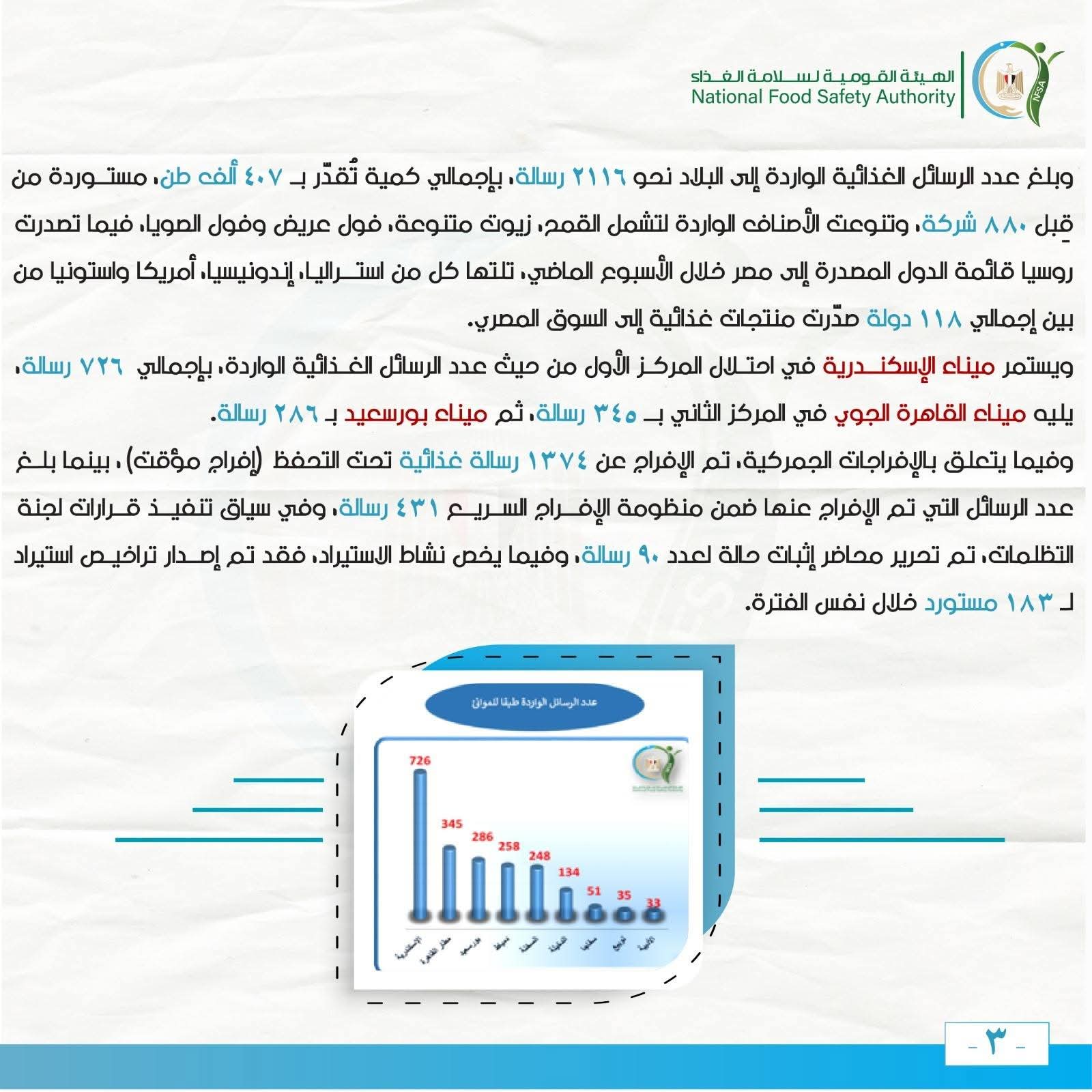 ويستمر ميناء الإسكندرية في احتلال المركز الأول من حيث عدد الرسائل الغذائية الواردة، بإجمالي 726 رسالة، يليه ميناء القاهرة الجوي في المركز الثاني بـــ 345 رسالة، ثم ميناء بورسعيد بـ 286 رسالة.