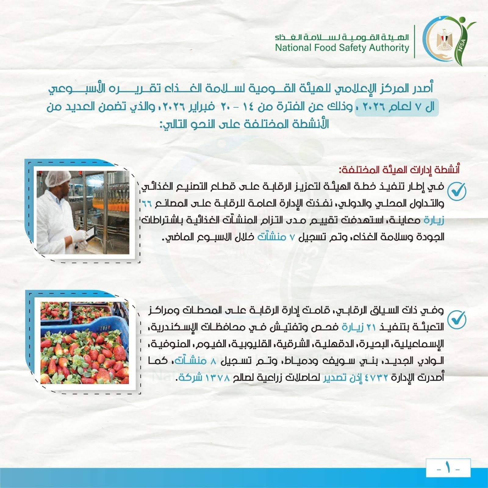 أصدر المركز الإعلامي للهيئة القومية لسلامة الغذاء تقريره الأسبوعي السابع لعام 2026، وذلك عن الفترة من 14 – 20 فبراير 2026، والذي تضمن العديد من الأنشطة المختلفة على النحو التالي: