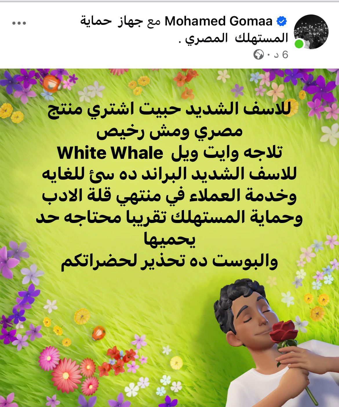 كتب محمد جمعة من خلال حسابه الرسمي عبر موقع التواصل الاجتماعي فيسبوك، قال: «للاسف الشديد حبيت اشتري منتج مصري ومش رخيص.. تلاجة وايت ويل White Whale للاسف الشديد البراند ده سئ للغاية وخدمة العملاء في منتهى قلة الأدب وحماية المستهلك تقريبًا محتاجة حد يحميها.. والبوست ده تحذير لحضراتكم».