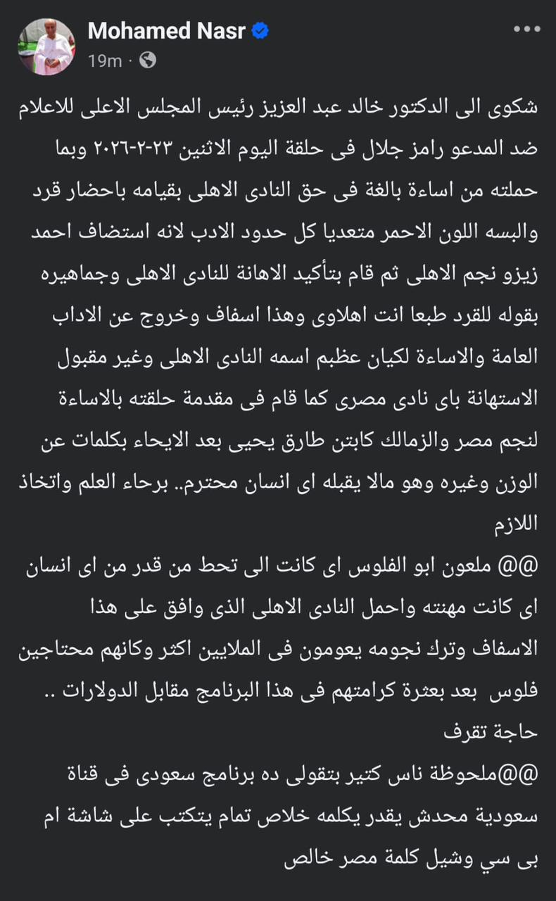 تقدم المخرج محمد نصر بشكوى إلى الدكتور خالد عبد العزيز، رئيس المجلس الأعلى للإعلام، ضد المدعو رامز جلال في حلقة اليوم الاثنين 23-2-2026 وبما حملته من إساءة بالغة في حق النادي الأهلي بقيامه بإحضار قرد وألبسه اللون الأحمر متعدياً كل حدود الأدب، لأنه استضاف أحمد زيزو نجم الأهلي ثم قام بتأكيد الإهانة للنادي الأهلي وجماهيره بقوله للقرد "طبعاً أنت أهلاوي"، واصفاً ذلك بالاسفاف والخروج عن الآداب العامة والإساءة لكيان عظيم اسمه النادي الأهلي، مؤكداً أنه غير مقبول الاستهانة بأي نادي مصري.