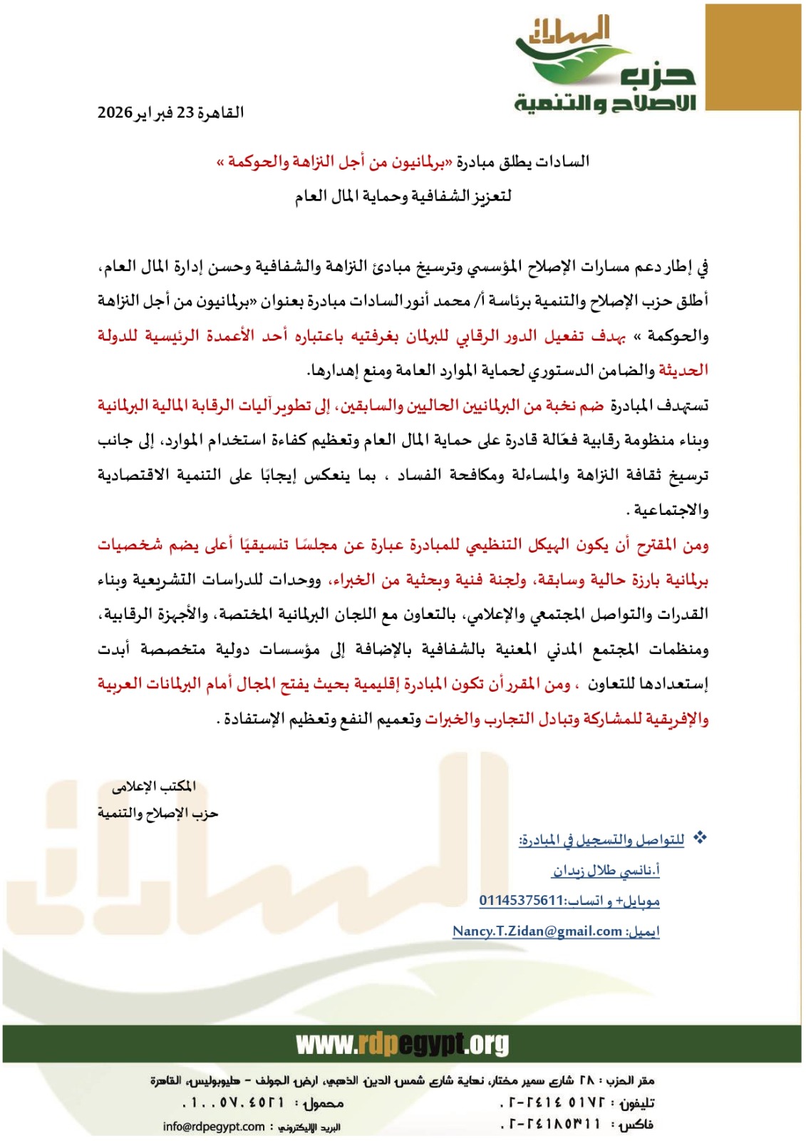 أطلق محمد أنور السادات، رئيس حزب الإصلاح والتنمية، مبادرة جديدة تحت عنوان «برلمانيون من أجل النزاهة والحوكمة»، وذلك في إطار دعم مسارات الإصلاح المؤسسي وترسيخ مبادئ الشفافية وحسن إدارة المال العام، وتعزيز الدور الرقابي للبرلمان بغرفتيه باعتباره أحد الأعمدة الدستورية لحماية الموارد العامة ومنع إهدارها.