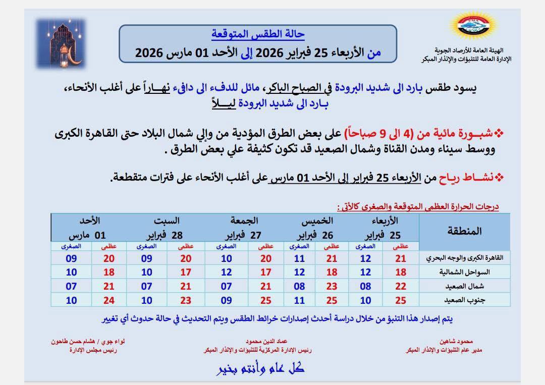 حالة الطقس غدا الأربعاء 25 فبراير 2026.. تشهد حالة الطقس غدا الأربعاء 25 فبراير 2026 حالة من التقلبات النسبية في درجات الحرارة، مع استمرار الأجواء الباردة خلال فترات الليل والصباح الباكر، واعتدال الطقس نهارًا على أغلب الأنحاء، وفقًا لتوقعات الهيئة العامة للأرصاد الجوية بشأن الفترة من الأربعاء 25 فبراير وحتى الأحد 1 مارس 2026.