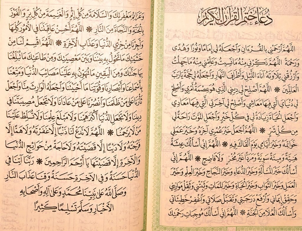 - "اللهم إنك عفو كريم تحب العفو فاعفُ عني، اللهم اجعل ختمتي هذه مباركة، واجعلها حجاباً لي من النار، وسبباً لدخولي الجنة بسلام."