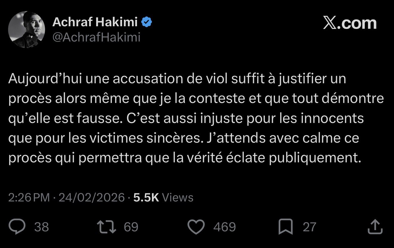 وعبر حسابه على منصة "إكس"، علّق حكيمي على القرار مؤكدًا نفيه التام للتهمة، وكتب أن مجرد توجيه اتهام من هذا النوع أصبح كافيًا للإحالة إلى المحاكمة، رغم إنكاره المستمر، مضيفًا أنه ينتظر القضاء بهدوء وثقة.