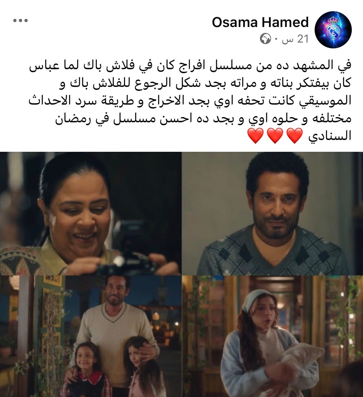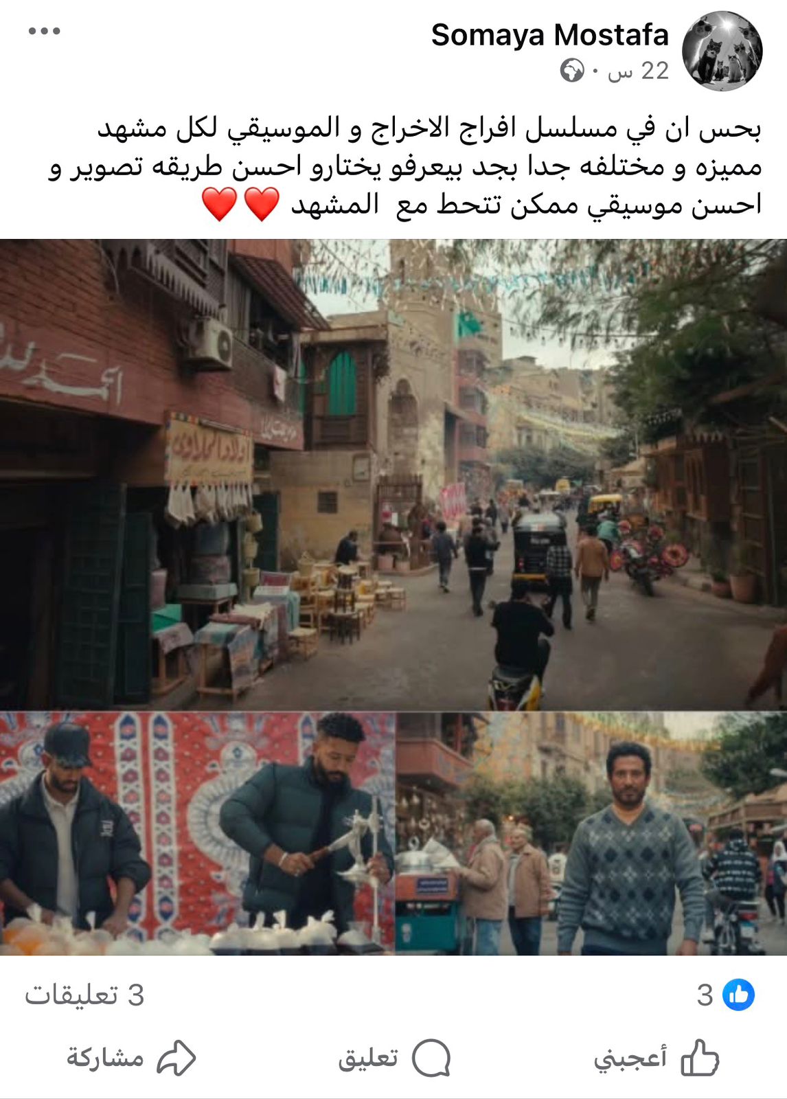 وفي ذلك السياق اشاد حساب يدعى سوميه مصطفى قائله، "بحس أن مسلسل افراج الإخراج والموسيقى لكل مشهد مميز ومختلف بجد كل الفريق بيعرف يختار احسن شيء في كل حاجة".