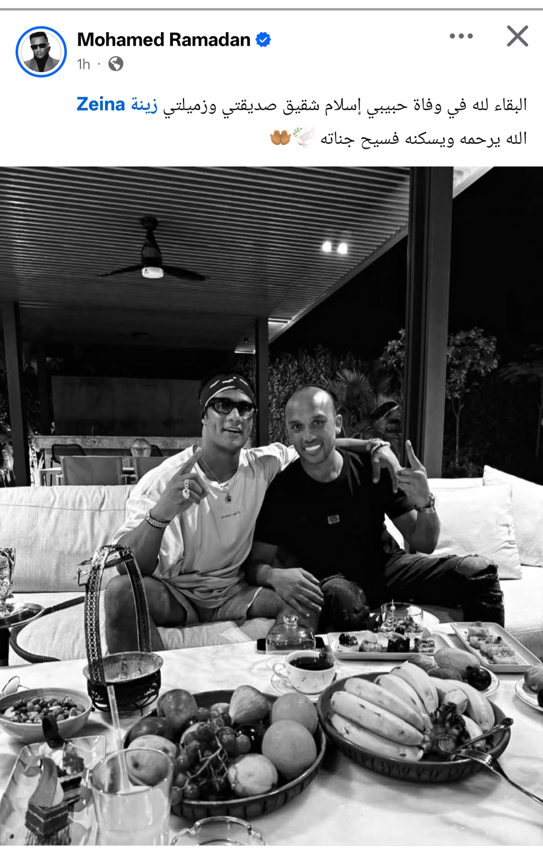 وشارك محمد رمضان جمهوره صورة تجمعهما، وكتب من خلال حسابه الرسمي عبر موقع التواصل الاجتماعي فيسبوك، قال: البقاء لله في وفاة حبيبي إسلام شقيق صديقتي وزميلتي زينة.. الله يرحمه ويسكنه فسيح جناته.