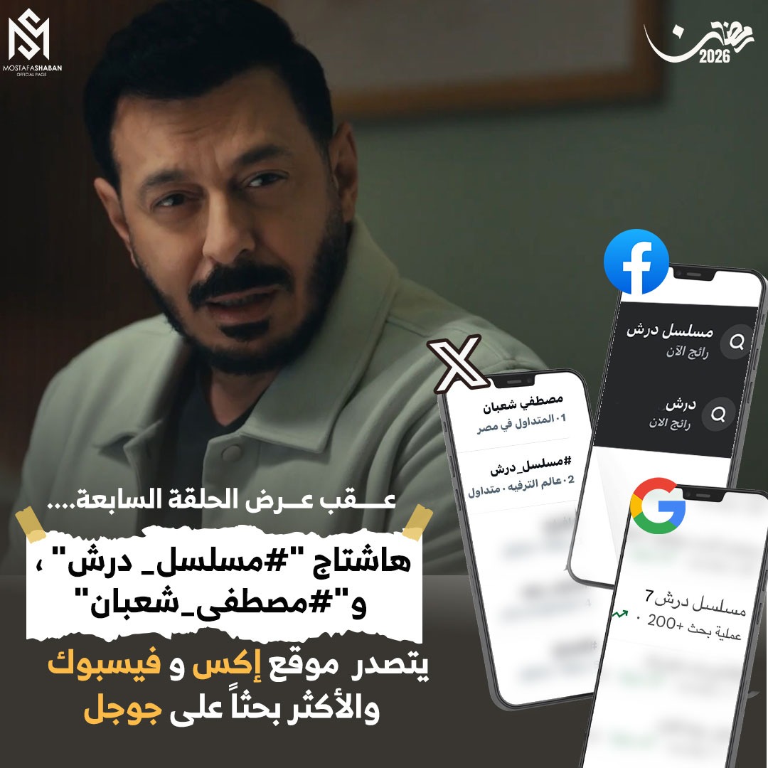 واصل مسلسل «درش» تصدر التريند بعد عرض الحلقة السابعة، حيث تصدرت هاشتاجات "مسلسل درش" و"مصطفى شعبان" قائمة الأكثر تداولًا على منصتي إكس وفيسبوك، بالإضافة إلى تواجدهما ضمن الأكثر بحثًا على جوجل، مما يعكس مدى شعبيته واهتمام الجمهور الكبير به.