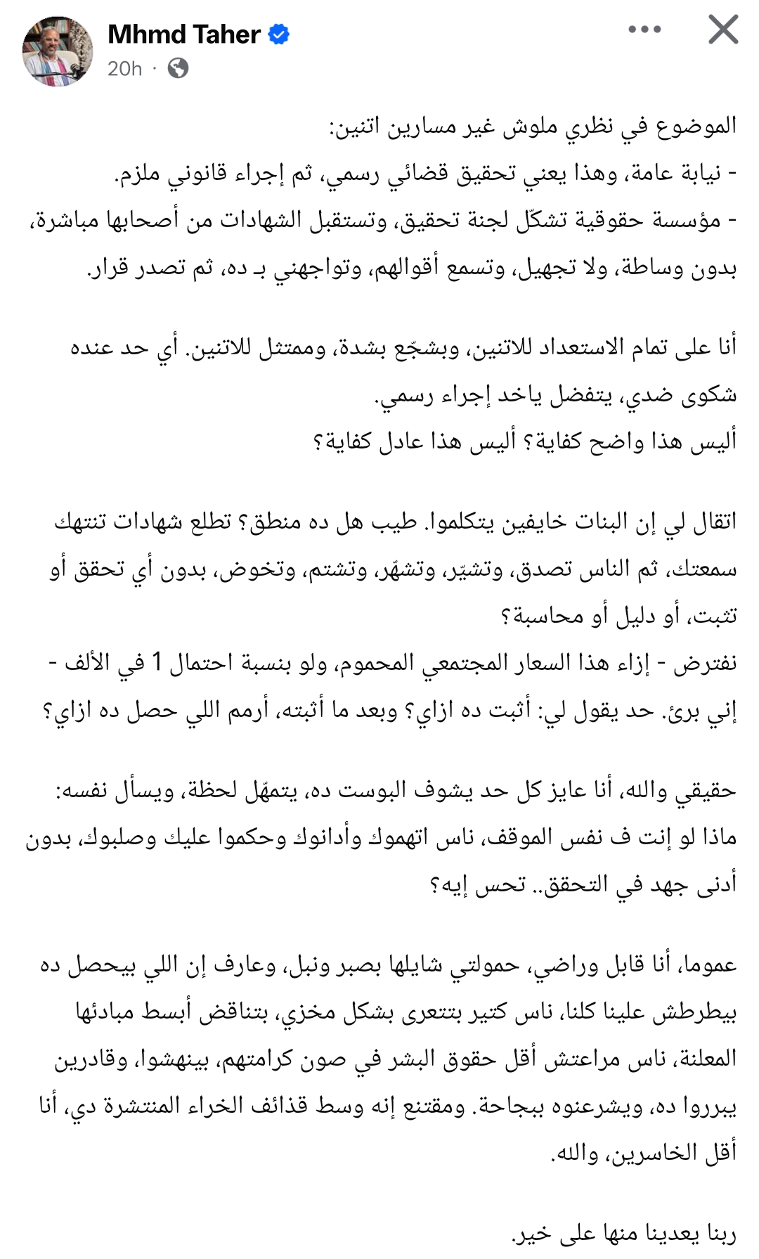 وكتب محمد طاهر من خلال حسابه الرسمي عبر موقع التواصل الاجتماعي فيسبوك، قال: الموضوع في نظري ملوش غير مسارين اتنين: نيابة عامة، وهذا يعني تحقيق قضائي رسمي، ثم إجراء قانوني ملزم.