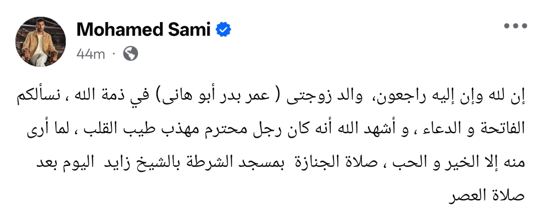 وكتب محمد سامي من خلال حسابه الرسمي عبر موقع التواصل الاجتماعي فيسبوك، قال: إن لله وإن إليه راجعون، والد زوجتى ( عمر بدر أبو هانى) في ذمة الله ، نسألكم الفاتحة و الدعاء ، و أشهد الله أنه كان رجل محترم مهذب طيب القلب ، لما أرى منه إلا الخير و الحب.