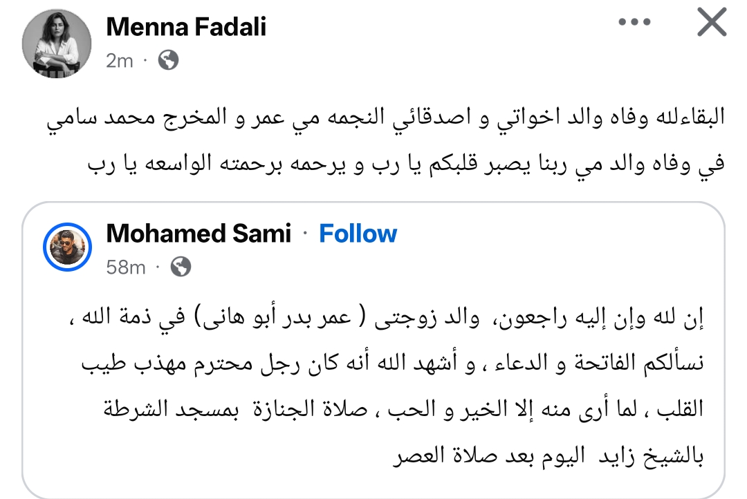 وكتب محمد سامي من خلال حسابه الرسمي عبر موقع التواصل الاجتماعي فيسبوك، قال: إن لله وإن إليه راجعون، والد زوجتى ( عمر بدر أبو هانى) في ذمة الله ، نسألكم الفاتحة و الدعاء ، و أشهد الله أنه كان رجل محترم مهذب طيب القلب ، لما أرى منه إلا الخير و الحب ، صلاة الجنازة بمسجد الشرطة بالشيخ زايد اليوم بعد صلاة العصر.