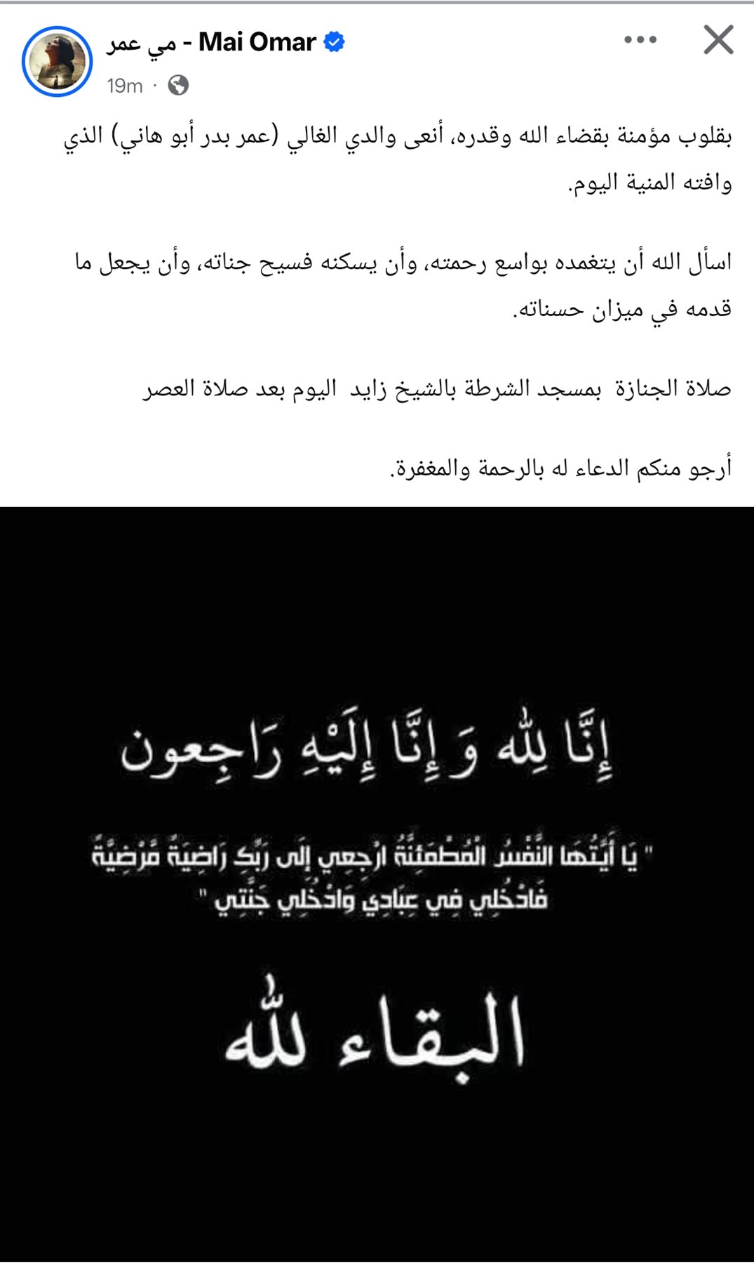 وكتبت مي عمر من خلال حسابها الرسمي عبر موقع التواصل الاجتماعي فيسبوك، قالت: بقلوب مؤمنة بقضاء الله وقدره، أنعى والدي الغالي (عمر بدر أبو هاني) الذي وافته المنية اليوم.