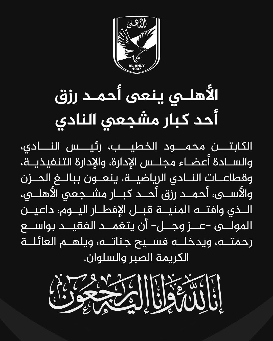 وجاء البيان تحت عنوان: الأهلي ينعى أحمد رزق أحد كبار مشجعي النادي، حيث تقدم الكابتن محمود الخطيب، رئيس النادي، وأعضاء مجلس الإدارة، والإدارة التنفيذية، وكافة قطاعات النادي الرياضية، بخالص التعازي في وفاة الفقيد، داعين الله أن يتغمده بواسع رحمته ويسكنه فسيح جناته، وأن يلهم أسرته ومحبيه الصبر والسلوان، مؤكدين: «إنا لله وإنا إليه راجعون».