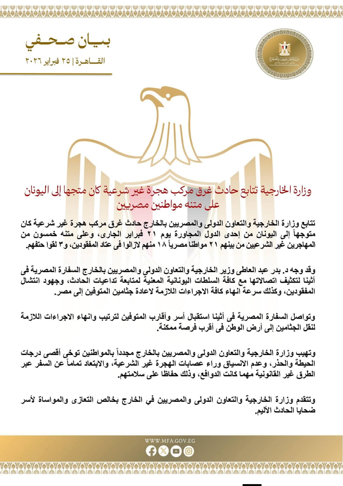 وتابعت الخارجية في بيانها: "أن الدكتور بدر عبد العاطي وجه السفارة المصرية في أثينا تكثيف اتصالاتها مع كافة السلطات اليونانية المعنية لمتابعة تداعيات الحادث، وجهود انتشال المفقودين، وكذلك سرعة إنهاء كافة الإجراءات اللازمة لإعادة جثماني المتوفين إلى مصر".