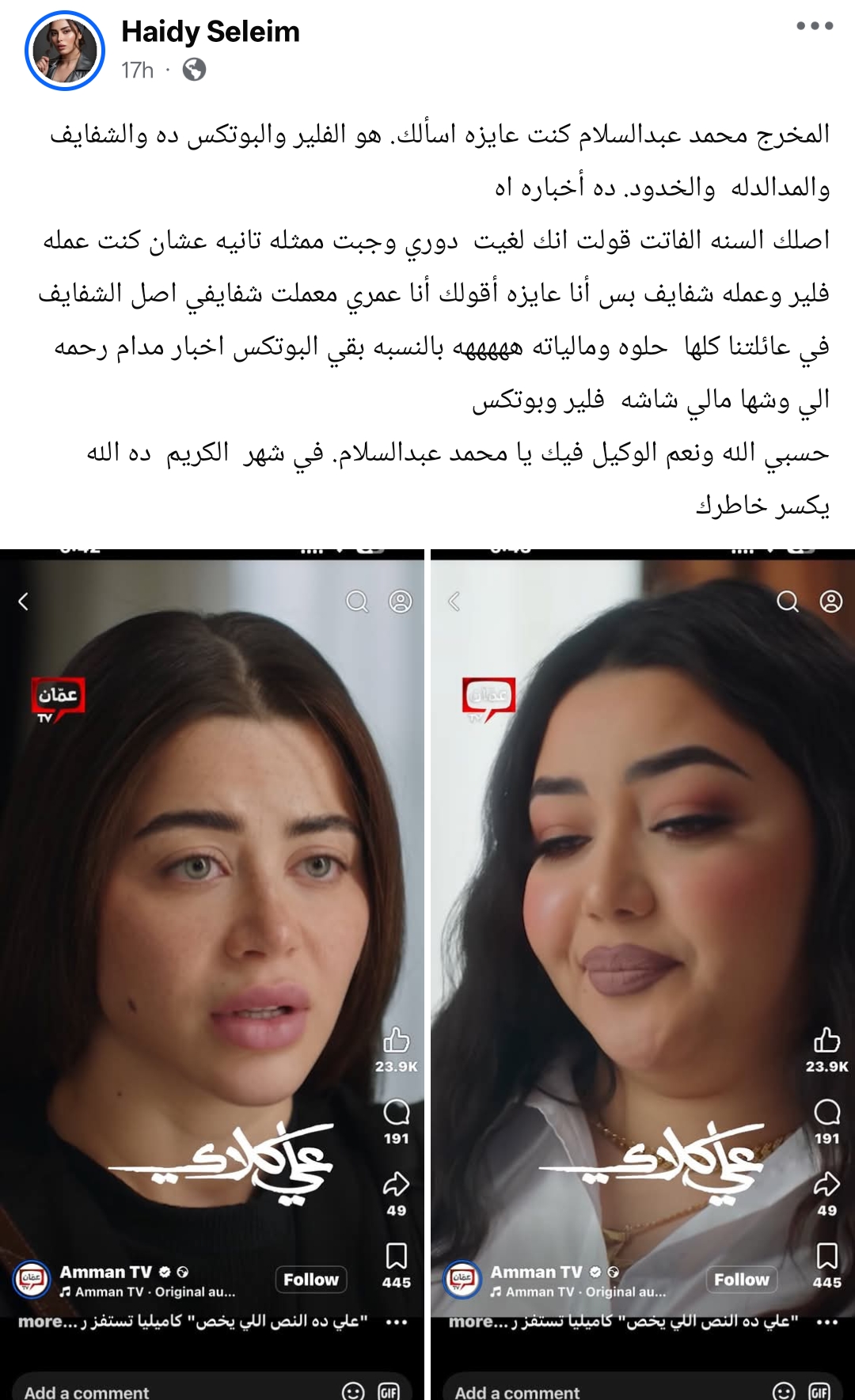 وكتبت هايدي سليم من خلال حسابها الرسمي عبر موقع التواصل الاجتماعي فيسبوك، قالت: المخرج محمد عبدالسلام كنت عايزه اسألك.. هو الفلير والبوتكس ده والشفايف المدالدله والخدود. ده أخباره اه.