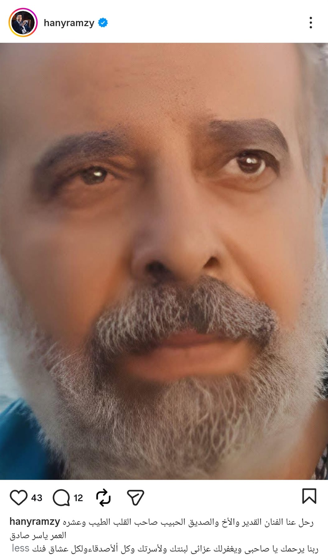 وكتب هاني رمزي من خلال حسابه الرسمي عبر موقع تبادل الصور والفيديوهات القصيرة «إنستجرام»، قال: «رحل عنا الفنان القدير والأخ والصديق صاحب القلب الطيب وعشرة العمر ياسر صادق».