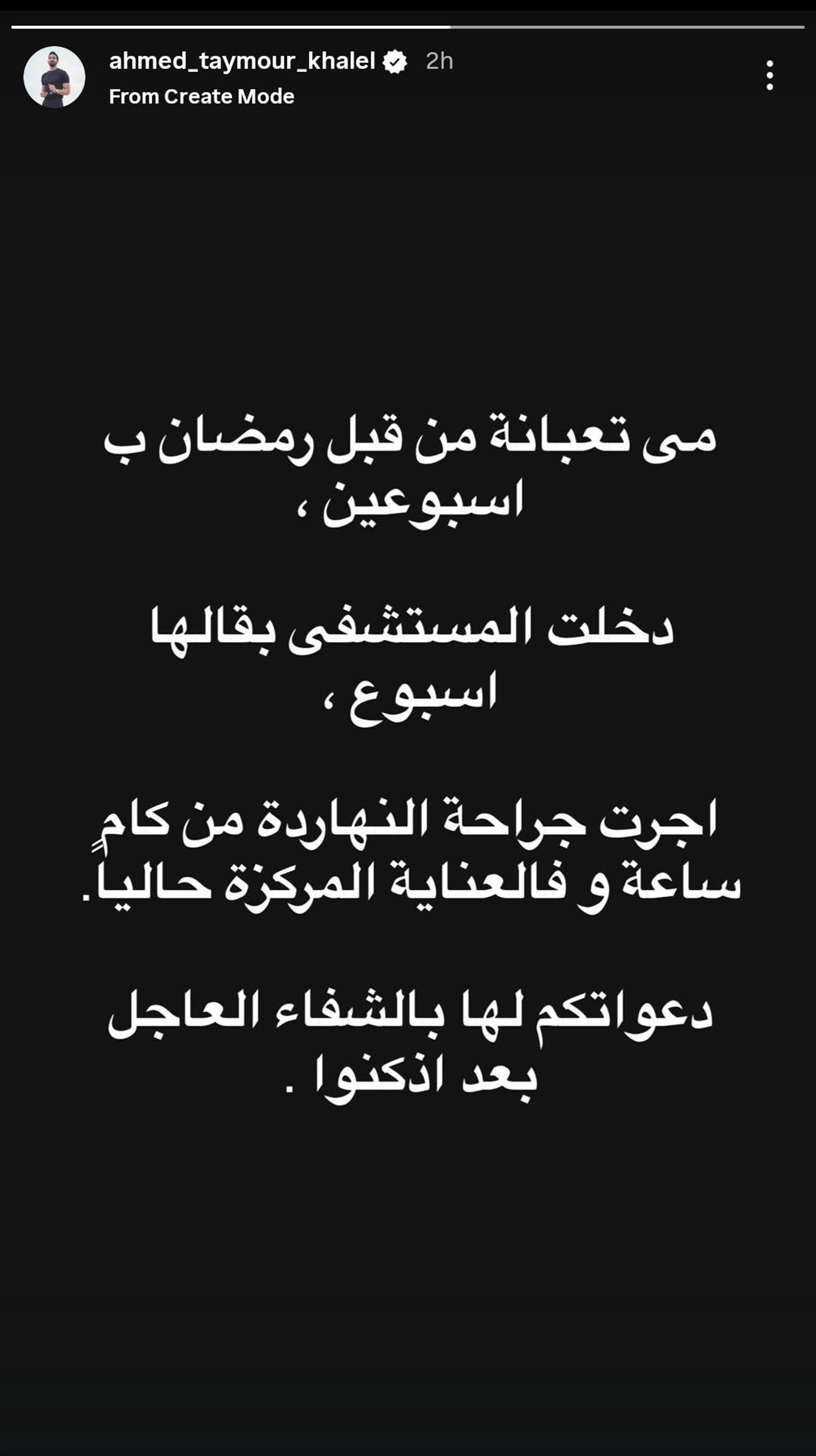 وأجرت مي عملية جراحية ودخلت إل العناية المركزة، وكتب أحمد تيمور من خلال حسابه الرسمي عبر موقع تبادل الصور والفيديوهات القصيرة إنستجرام، عبر خاصية ستوري، مطالبًا الدعاء لها: مي تعبانة من قبل رمضان باسبوعين، دخلت المستشفى بقالها اسبوع، اجرت جراحة النهاردة من كام ساعة وفي العناية المركزة حاليا.. دعواتكم لها بالشفاء العاجل بعد اذنكو.