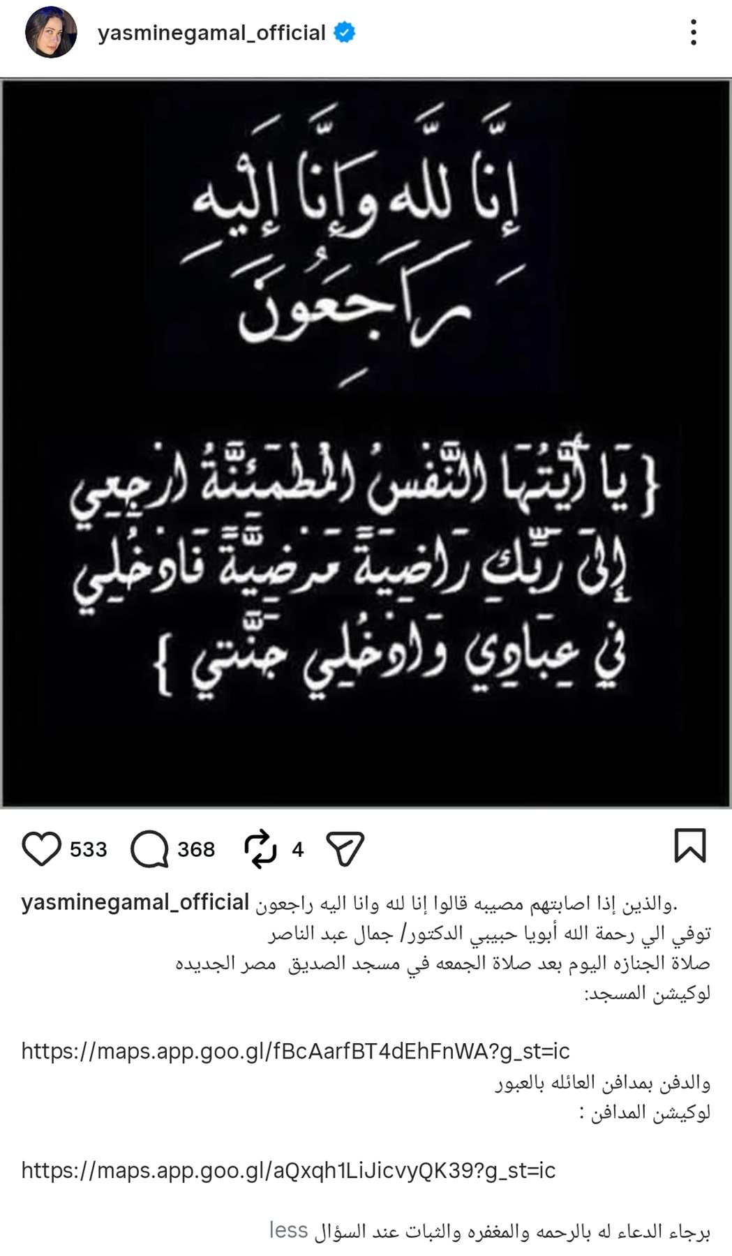 وكتبت ياسمين جمال من خلال حسابها الرسمي عبر موقع تبادل الصور والفيديوهات القصيرة إنستجرام، قالت: والذين إذا اصابتهم مصيبه قالوا إنا لله وانا اليه راجعون.. توفي الي رحمة الله أبويا حبيبي الدكتور / جمال عبد الناصر.