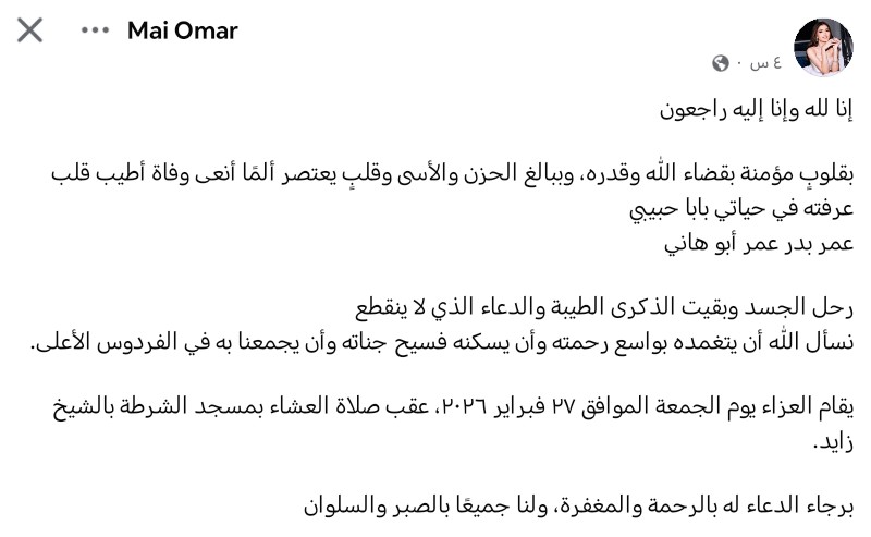 حيث قالت مي عمر عبر حسابها الرسمي بموقع التواصل الاجتماعي «فيسبوك»، قائلة: «إنا لله وإنا إليه راجعون بقلوبٍ مؤمنة بقضاء الله وقدره، وببالغ الحزن والأسى وقلبٍ يعتصر ألمًا أنعى وفاة أطيب قلب عرفته في حياتي بابا حبيبي عمر بدر عمر أبو هاني».