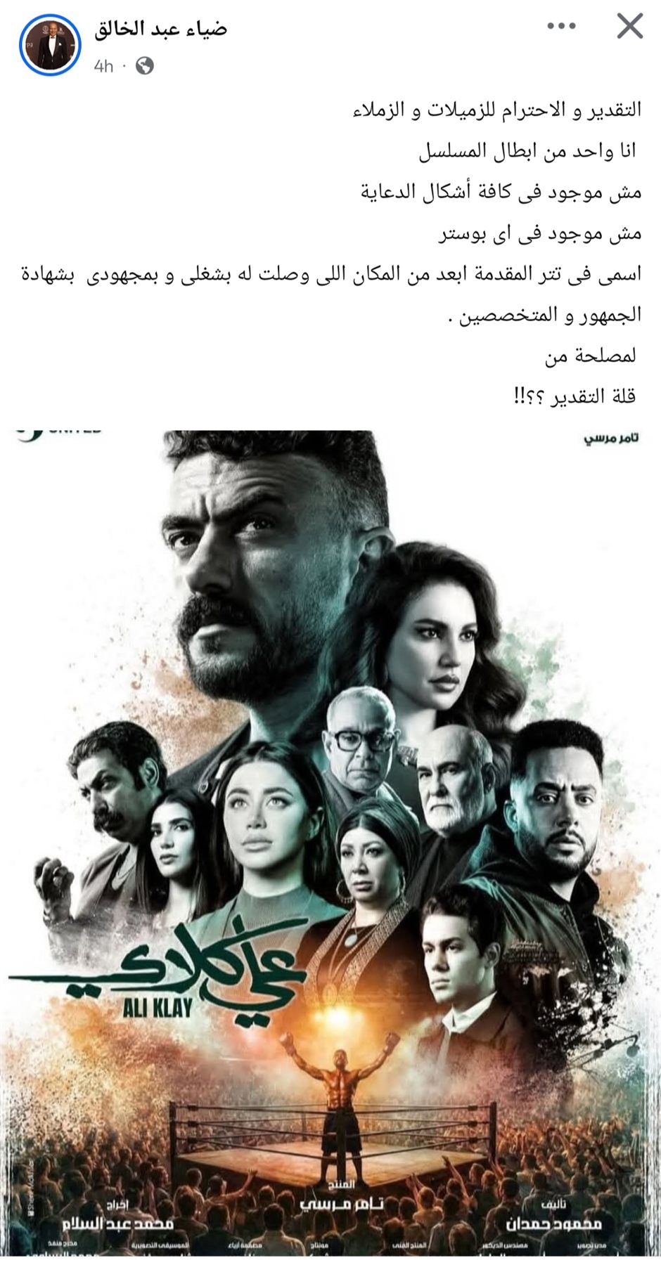 رسالة غاضبة من ضياء عبد الخالق بسبب تجاهله في دعاية «علي كلاي»|تفاصيل