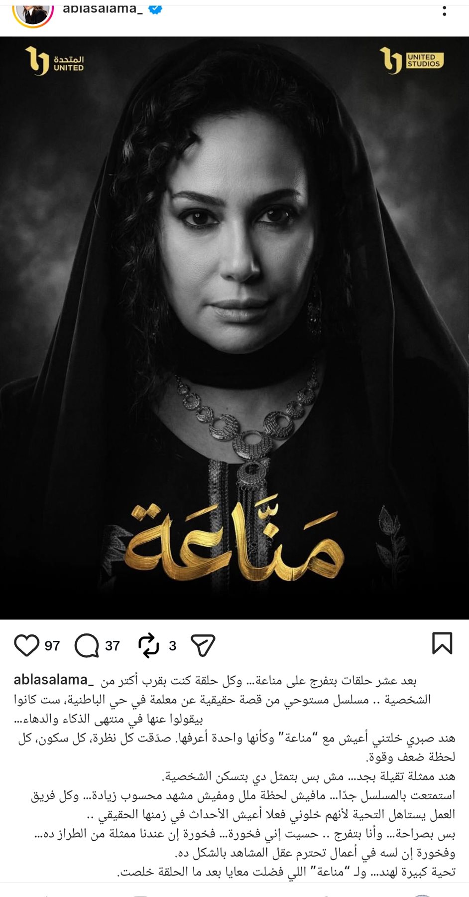 أختتمت: «بس بصراحة.. وأنا بتفرج حسيت إني فخورة.. فخورة إن عندنا ممثلة من الطراز ده، وفخورة إن لسه في أعمال تحترم عقل المشاهد بالشكل ده.. تحية كبيرة لهند.. ولـ "مناعة" اللي فضلت معايا بعد ما الحلقة خلصت».