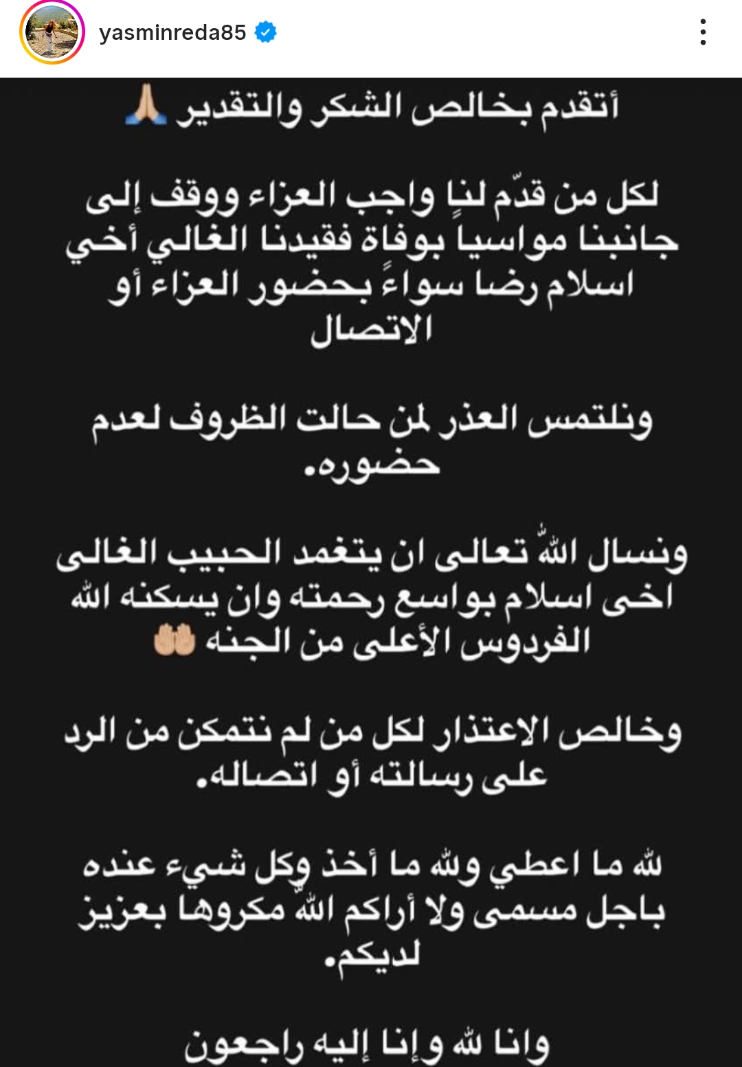 وكتبت ياسمين من خلال حسابها الرسمي عبر موقع تبادل الصور والفيديوهات القصيرة إنستجرام، قالت: أتقدم بخالص الشكر والتقدير لكل من قدم لنا واجب العزاء ووقف إلى جانبنا مواسيا بوفاة فقيدنا الغالي أخي اسلام رضا سواء بحضور العزاء أو الاتصال.