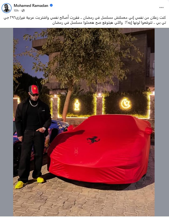 وكتب محمد رمضان من خلال حسابه الرسمي عبر موقع التواصل الاجتماعي فيسبوك: كنت زعلان من نفسي إني معملتش مسلسل في رمضان.. فقررت أصالح نفسي واشتريت عربية فيراري 296 جي تي بي.. تتوقعوا لونها إيه؟! واللي هيتوقع صح هعملوا مسلسل في رمضان.