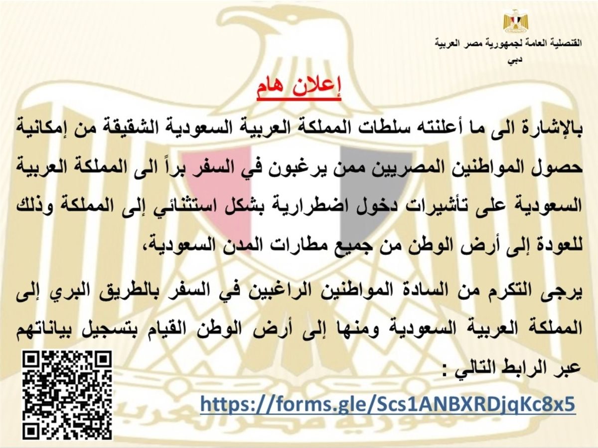 أعلنت القنصلية العامة المصرية في دبي، فتح باب تسجيل أسماء المصريين الراغبين في العودة إلى مصر برا عبر السعودية.