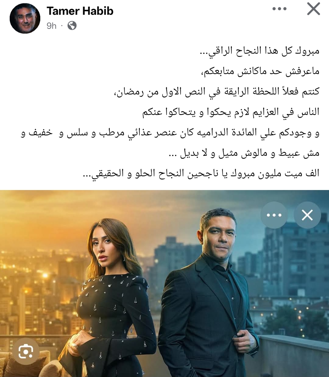 وكتب تامر حبيب من خلال حسابه الرسمي عبر موقع التواصل الاجتماعي فيسبوك، قال: مبروك كل هذا النجاح الراقي.. ماعرفش حد ماكانش متابعكم، كنتم فعلاً اللحظة الرايقة في النص الاول من رمضان، الناس في العزايم لازم يحكوا و يتحاكوا عنكم.