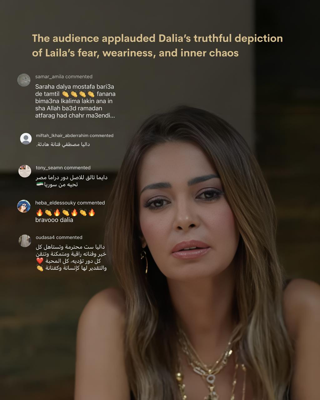 وأعادت مشاركة داليا مصطفى في أكثر من عمل هذا الموسم تسليط الضوء على موهبتها، حيث لاقت إشادات واسعة من الجمهور على مواقع التواصل الاجتماعي، الذين أثنوا على أدائها القوي وحضورها المميز في دراما رمضان.