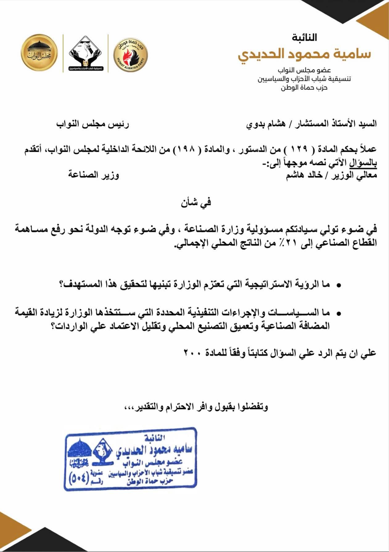 تقدّمت النائبة سامية محمود الحديدي، عضو مجلس النواب المصري، بسؤال برلماني إلى وزير الصناعة، بشأن استراتيجية الوزارة خلال المرحلة المقبلة لتعزيز دور القطاع الصناعي في الاقتصاد الوطني.