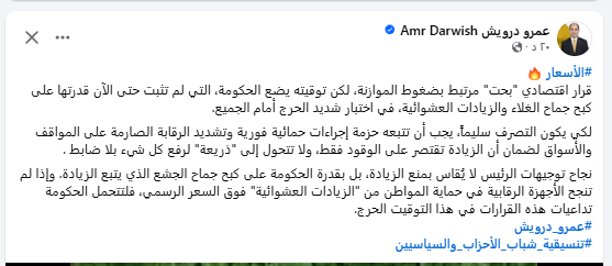 وأشار درويش، في منشور له عبر صفحته الرسمية على موقع التواصل الاجتماعي فيس بوك، إلى أن توقيت تطبيق القرار يضع الحكومة أمام اختبار صعب، خاصة مع استمرار شكاوى المواطنين من ارتفاع الأسعار والزيادات غير المنضبطة في الأسواق.