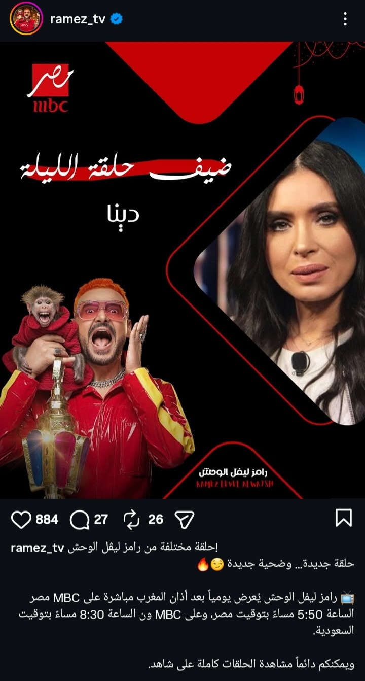 تحل الفنانة دينا اليوم الثلاثاء ضيفة على برنامج "رامز ليفل الوحش"، الذي يقدمه الفنان رامز جلال ويتم عرضه عبر شاشة MBCمصر خلال شهر رمضان المبارك لعام 2026.
