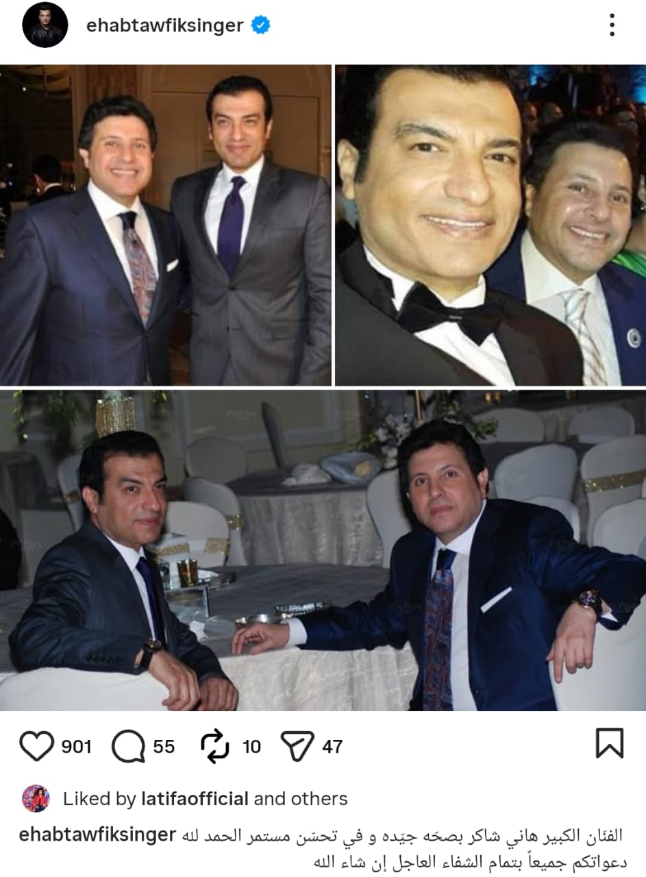 وحرص الفنان إيهاب توفيق على طمئنة جمهوره بعد هذه الشائعات، ونشر صورا تجمعهما من خلال حسابه الرسمي عبر موقع تبادل الصور والفيديوهات القصيرة إنستجرام، وعلق: الفنان الكبير هاني شاكر بصحة جيدة وفي تحسن مستمر الحمد لله.. دعواتكم جميعا بتمام الشفاء العاجل إن شاء الله.