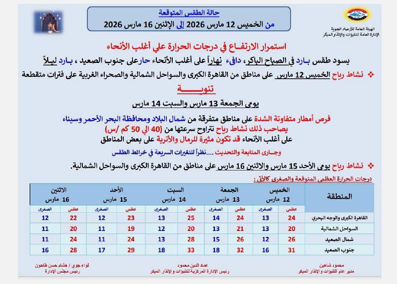 حالة الطقس غداً الخميس 12 مارس وحتى الإثنين 16 مارس 2026.. تشهد مصر خلال الأيام المقبلة تغيرات ملحوظة في الأحوال الجوية، حيث أعلنت الهيئة العامة للأرصاد الجوية تفاصيل حالة الطقس المتوقعة بداية من الخميس 12 مارس وحتى الإثنين 16 مارس 2026، والتي تشير إلى استمرار الارتفاع التدريجي في درجات الحرارة على أغلب الأنحاء، مع نشاط للرياح وفرص لسقوط أمطار متفاوتة الشدة في بعض المناطق.
