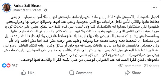 وكتبت فريدة سيف النصر من خلال حسابها الرسمي عبر موقع التواصل الاجتماعي فيسبوك: لاحول ولاقوة الا بالله.. مش عايزه اتكلم بس ماقدرتش.. ياجماعه ماينفعش اجيب مثلا أمن أو سواق مع بنتي يحافظ عليها والاقي الأمن داخل غراميات مع اللي بيحرسها، وبنتي عند ابوها وسواقها بيزعق لها وغيران.. يعني بتفهموا اللي بيشتغلوا يعملوا ايه بالظبط.