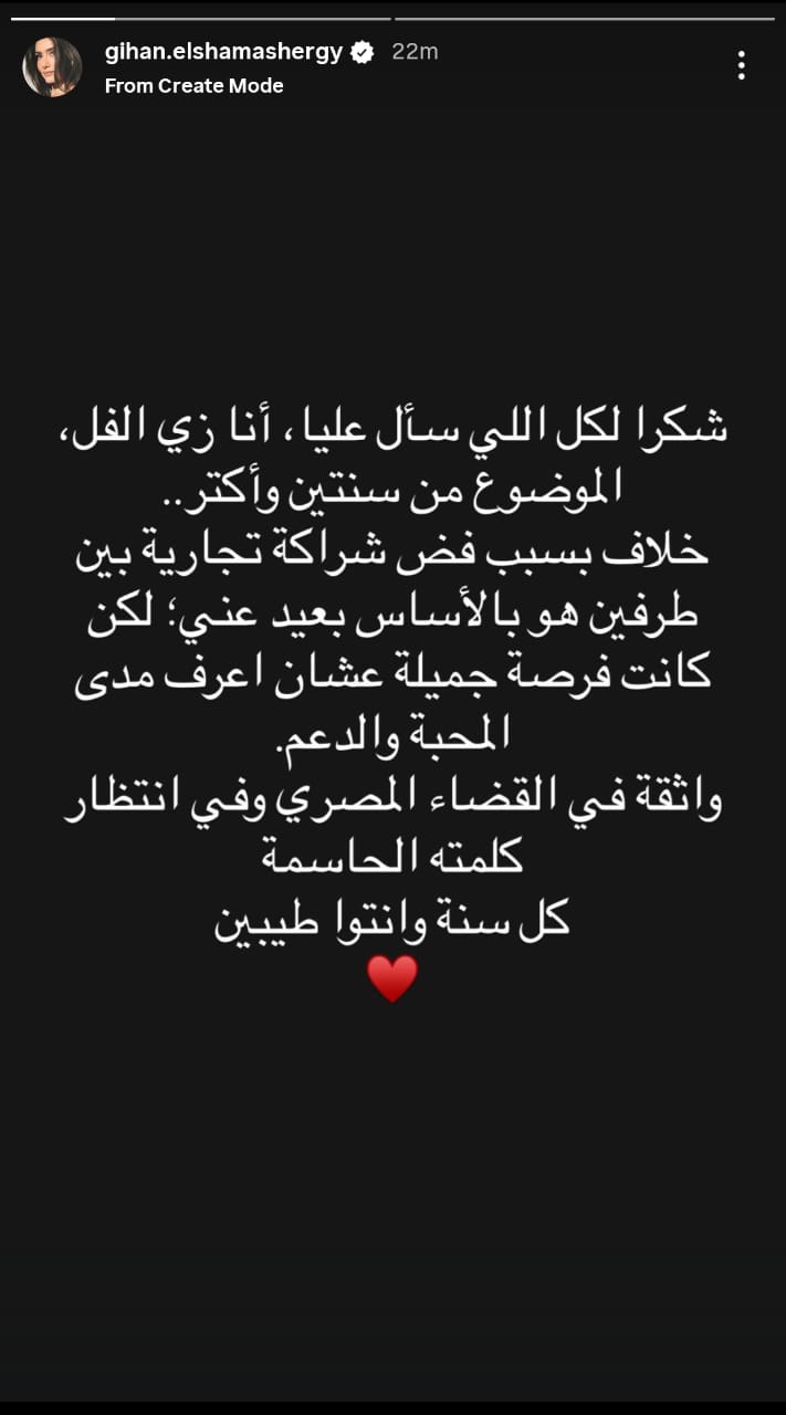 وفي أول تعليق لها بعد هذه الاتهامات، كتبت جيهان الشماشرجي من خلال حسابها الرسمي عبر موقع تبادل الصور والفيديوهات القصيرة إنستجرام، عبر خاصية ستوري: شكرا لكل اللي سأل عليا، أنا زي الفل الموضوع من سنتين وأكثر.. خلاف بسبب فض شراكة تجارية بين طرفين هو بالأساس بعيد عني؛ لكن كانت فرصة جميلة عشان اعرف مدى المحبة والدعم.