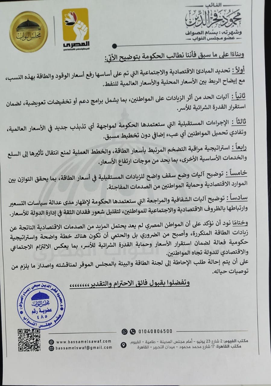 تقدم النائب بسام الصواف عضو مجلس النواب عن الحزب المصري الديمقراطي الاجتماعي بطلب إحاطة إلي المستشار هشام بدوي رئيس مجلس النواب ، موجه إلى رئيس مجلس الوزراء ووزير البترول والثروة المعدنية بشأن الارتفاع الغير مسبوق في أسعار المحروقات، وما يترتب على ذلك من تداعيات خطيرة على المواطنين والاقتصاد الوطني.