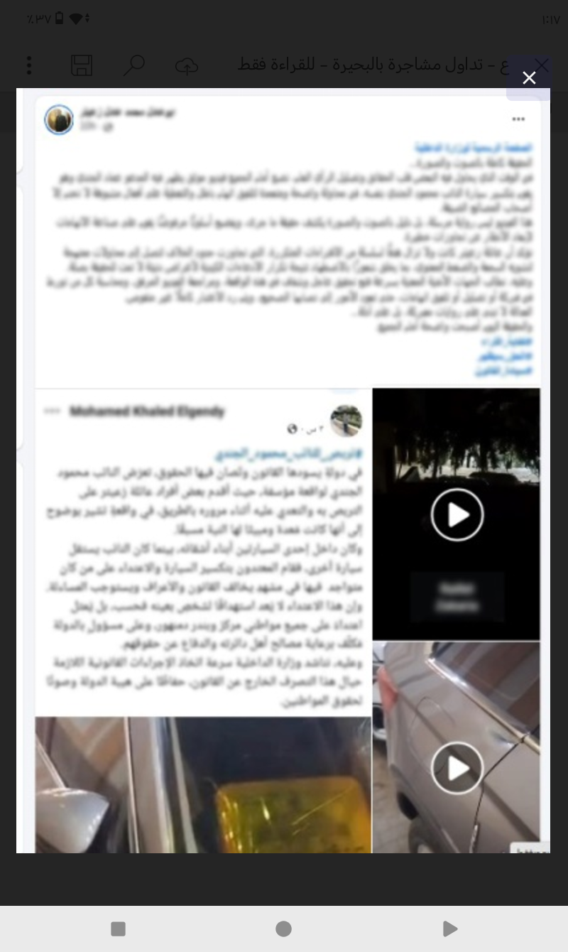 جاء ذلك فى إطار كشف ملابسات منشور مدعوم بمقطعى فيديو تم تداوله بأحد الحسابات الشخصية بمواقع التواصل الإجتماعى تضمن قيام أحد الأشخاص بإتلاف زجاج سيارة أحد أعضاء مجلس النواب حال سيره بالبحيرة.