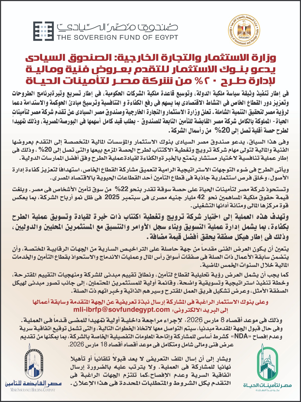 وعلى بنوك الاستثمار الراغبة فى المشاركة إرسال نبذة تعريفية عن الجهة المتقدمة وسابقة أعمالها إلى البريد الإلكترونى: [email protected] وذلك فى موعد أقصاه 8 مارس 2026، لإجراء مراجعة داخلية أولية تمهيدا للمضى قدما فى العملية.