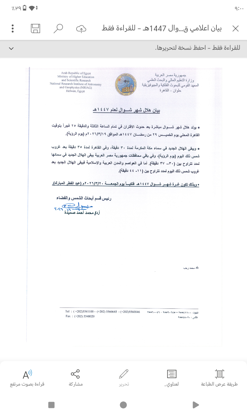 أصدر المعهد القومي للبحوث الفلكية والجيوفيزيقية بيانًا رسميًا بشأن الحسابات الفلكية لهلال شهر شوال لعام ١٤٤٧هـ كاشفًا التفاصيل الكاملة لموعد ميلاد الهلال وتوقيت غرة الشهر الكريم في مصر وعدد من الدول العربية والإسلامية.