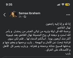 كتبت سماء إبراهيم في منشور عبر حسابها الشخصي بموقع فيس بوك: «إنا لله و إنا إليه راجعون نهال القاضي.. برحمة الله في ليلة وترية من ليالي العشر من رمضان وبأمر الله استرد وديعته في روح الجميلة نهال القاضي بعد غيبوبة أكثر منذ أربعون يومًا».