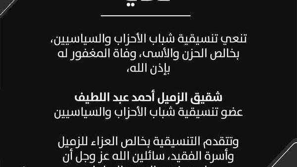 تنسيقية شباب الأحزاب والسياسيين تنعي وفاة شقيق الزميل أحمد عبد اللطيف عضو التنسيقية