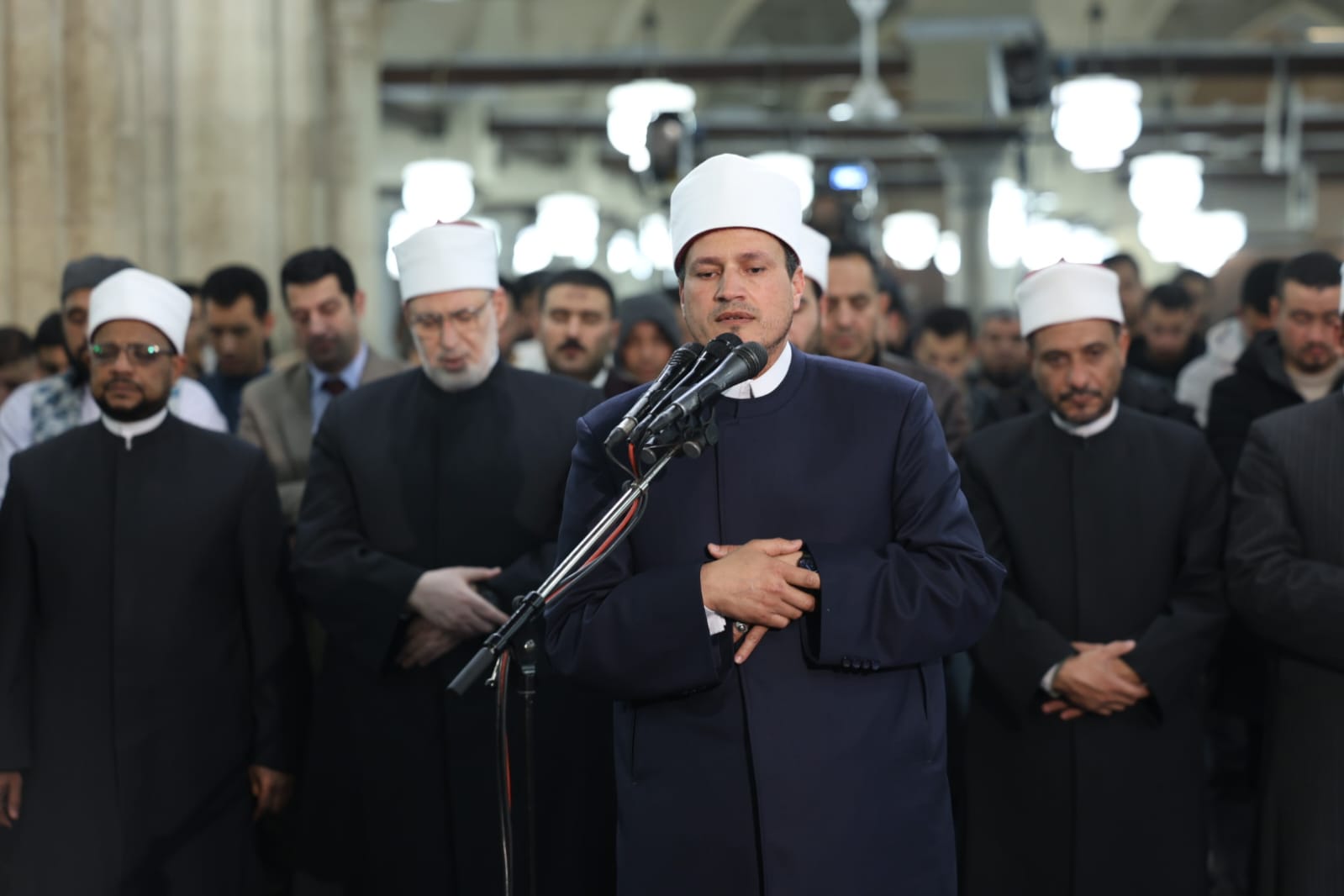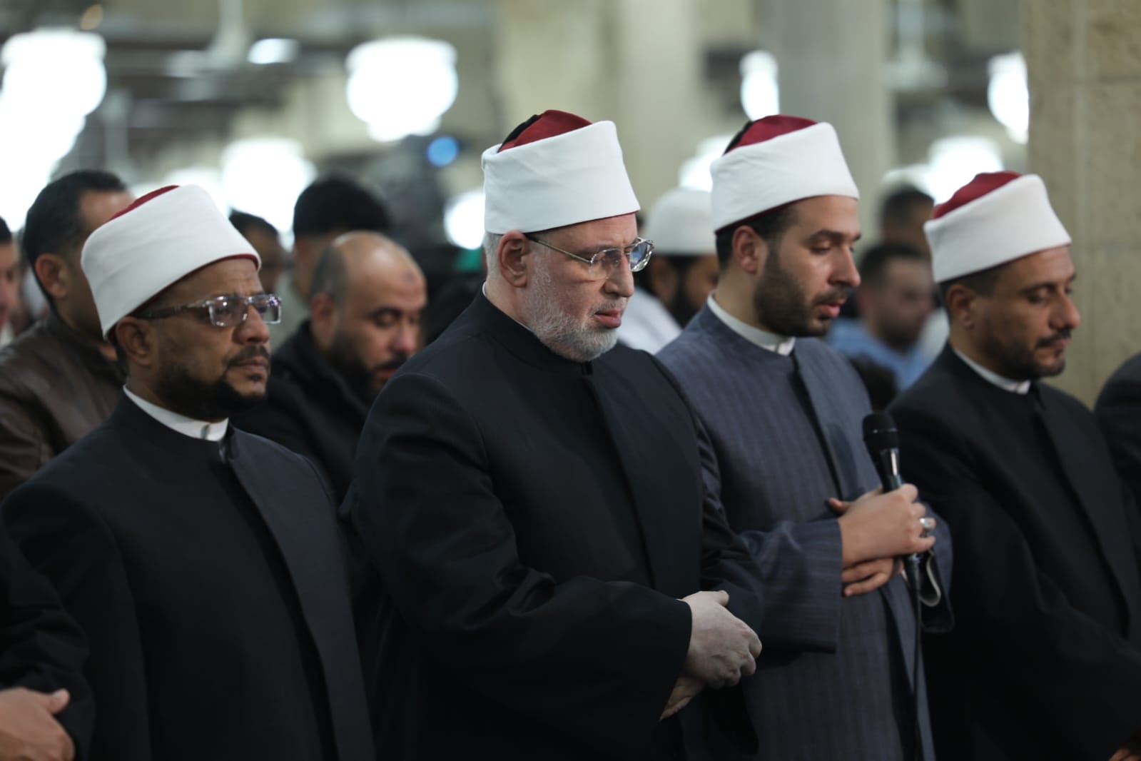 وتقدَّم صفوف المصلين فضيلة أ.د/ محمد الضويني، وكيل الأزهر، وأ.د عباس شومان، أمين عام هيئة كبار العلماء، وأ.د/ محمد الجندي، الأمين العام لمجمع البحوث الإسلامية، والدكتور هاني عودة، مدير الجامع الأزهر، والشيخ حسن عبدالنبي، وكيل لجنة مراجعة المصحف، إلى جانب لفيف من علماء الأزهر الشريف وقياداته، حيث شاركوا جموع المصلين الدعاء والتضرع إلى الله تعالى أن يتقبل صالح الأعمال، وأن يعمَّ الخير والبركة على مصر والأمة الإسلامية.
