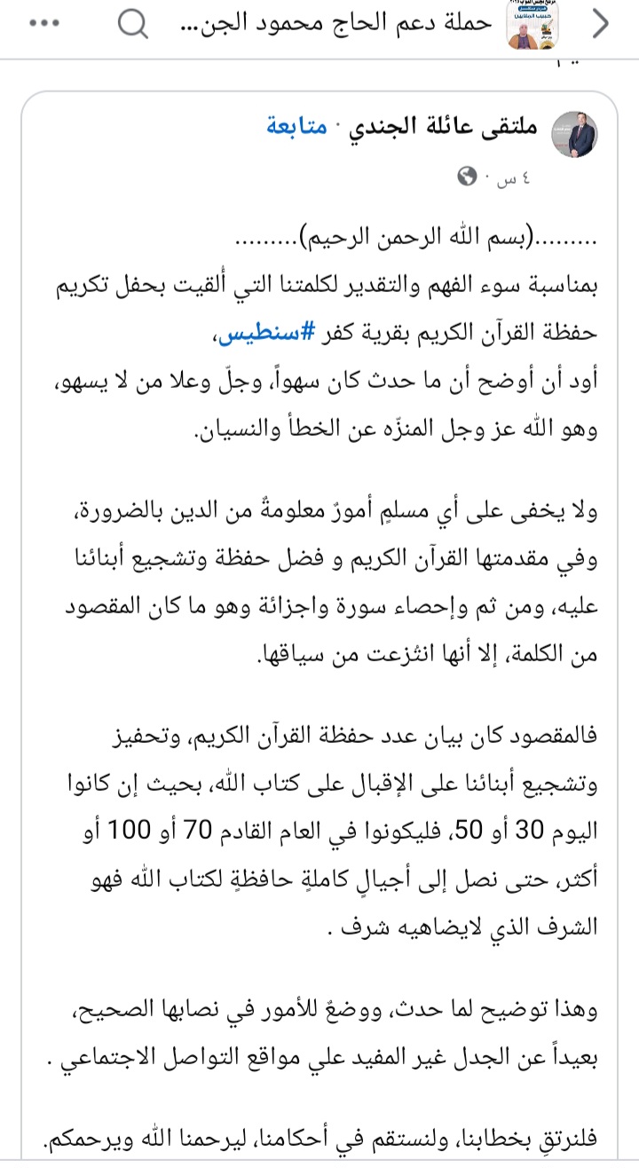 وفي أول رد له، نشر النائب محمود الجندي توضيحًا عبر صفحة حملته الرسمية على موقع “فيسبوك”، أكد فيه أن ما بدر منه كان مجرد سهو غير مقصود، مشددًا على أن الله سبحانه وتعالى منزّه عن الخطأ والنسيان، وأن حديثه لم يكن يحمل أي نية للإساءة إلى القرآن الكريم أو حفظته.