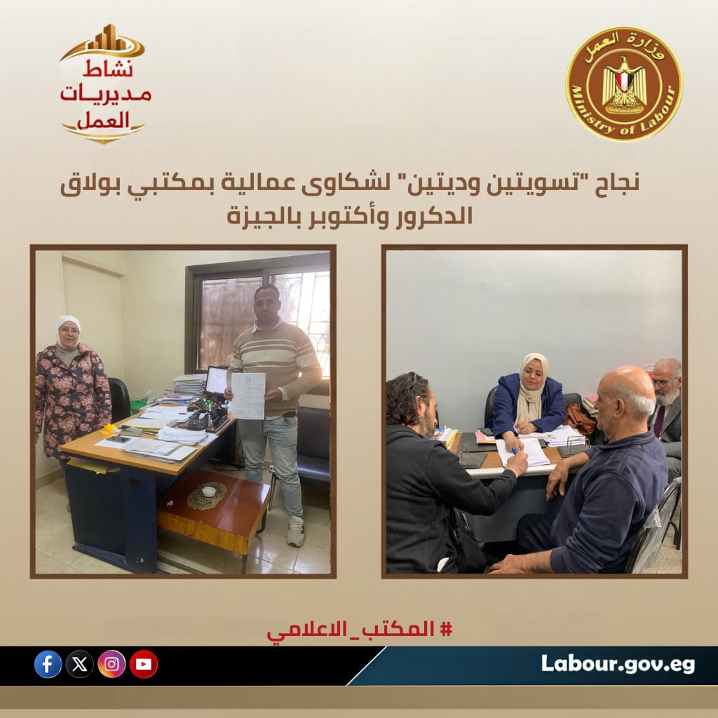 أعلنت مديرية عمل القاهرة، بإشراف سيد الشرقاوي مدير المديرية و إسلام أحمد وكيل المديرية، عن نجاح مكتب عمل شرق مدينة نصر ومصر الجديدة في إتمام تسوية ودية لشكاوى عمالية دون اللجوء للقضاء. شملت التسوية صرف المستحقات المالية، ورصيد الإجازات، وتسليم شهادات الخبرة ومسوغات التعيين لعاملين ، وذلك تنفيذاً لتوجيهات الوزير حسن الرداد بتعزيز الحلول السلمية للنزاعات وضمان حقوق طرفي العملية الإنتاجية بـمحافظة القاهرة