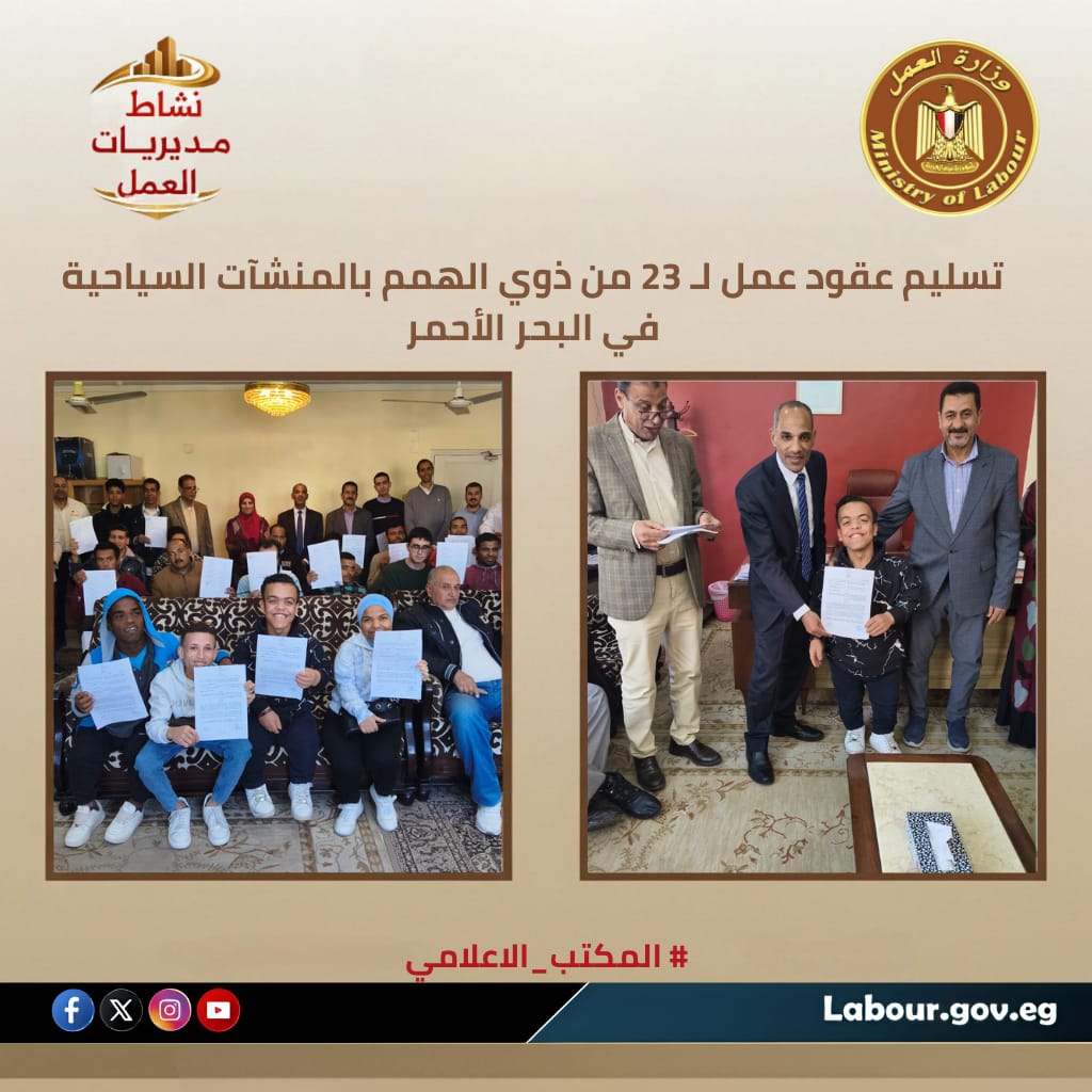 تنفيذاً لتوجيهات الوزير حسن رداد بتمكين ذوي الهمم ودمجهم في سوق العمل؛ قام أحمد جابر مدير مديرية عمل البحر الأحمر بتسليم عقود عمل لـ 23 شاباً من ذوي القدرات الخاصة للعمل بمنشآت سياحية كبرى. جرت مراسم التسليم بحضور قيادات المديرية ومديري مكاتب (الغردقة، وسفاجا، والقصير)، حيث أكد "جابر" التزام المديرية بتطبيق نسبة الـ 5% وتوفير فرص عمل لائقة ومستقرة تضمن الدمج المجتمعي والتمكين الاقتصادي لهذه الفئة بمحافظة البحر الأحمر