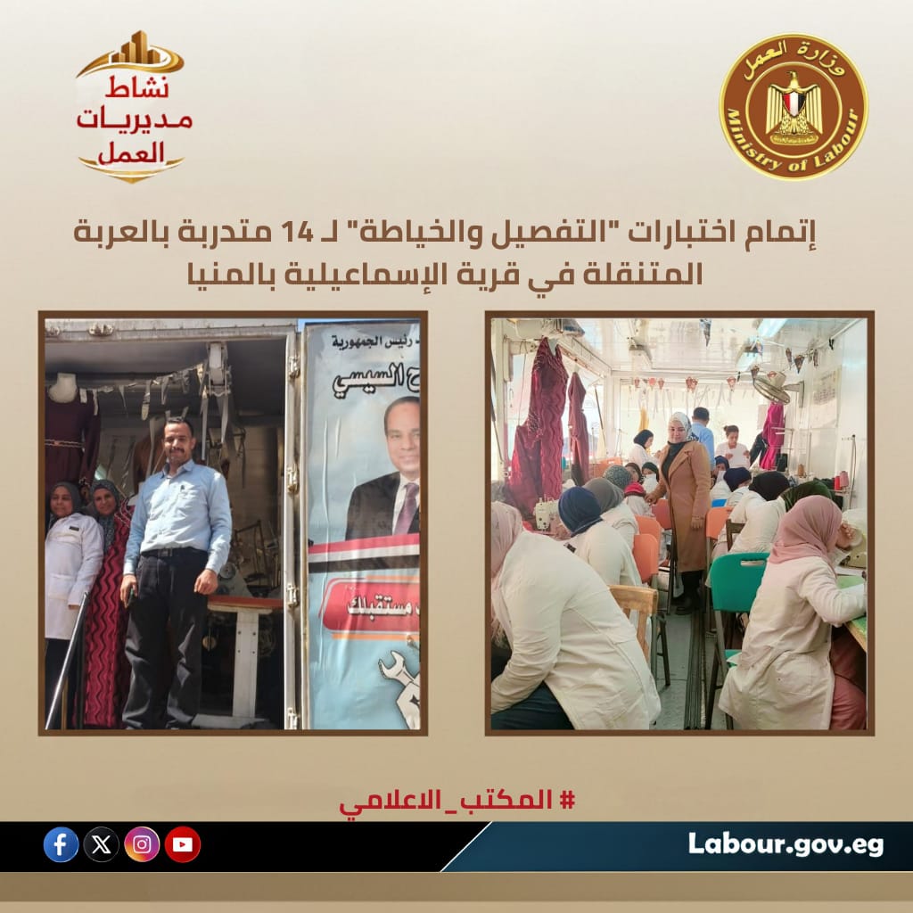 تحت رعاية الوزير حسن رداد، نظمت مديرية العمل بالمنيا الاختبارات النظرية والعملية لعدد 14 متدربة على مهنة "التفصيل والخياطة" داخل العربة المتنقلة بقرية الإسماعيلية. تأتي هذه الاختبارات، التي جرت بإشراف إدارة بحوث العمالة، كختام للبرنامج التدريبي المكثف الهادف لتمكين المرأة ريفياً واقتصادياً وتأهيلها لسوق العمل أو البدء في مشروعات صغيرة بمركز المنيا